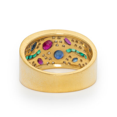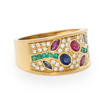 Round diamonds, oval and marquise cut rubies, oval and marquise cut sapphires, and round emeralds. 18 karat yellow gold. Ring size 6 3/4.