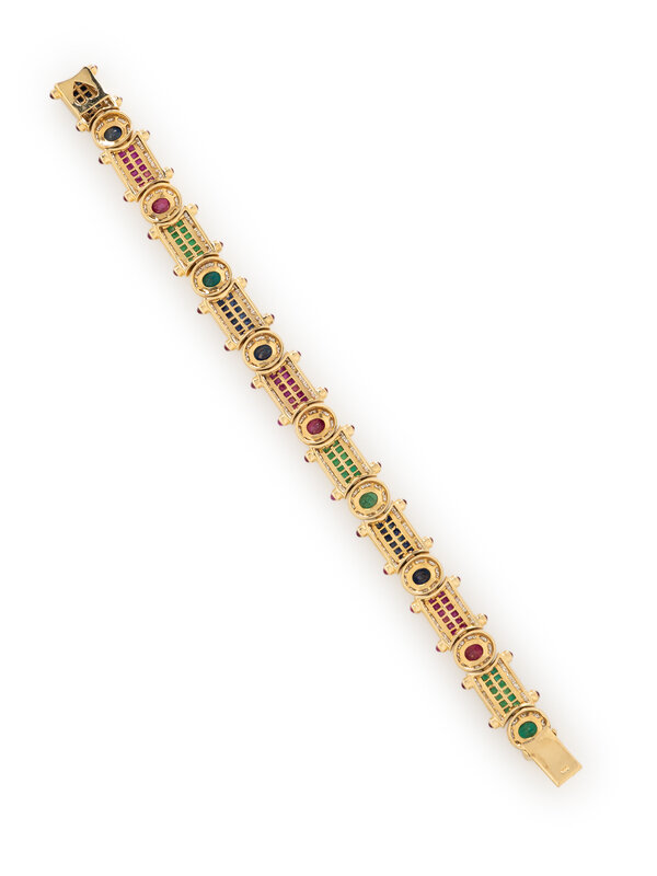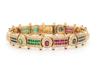 Square and oval sapphire, emerald, and ruby, round cabochon ruby finials, and round diamonds weighing approximately 3.00 carats total. 14 karat yellow gold. 7 3/4 inches long.