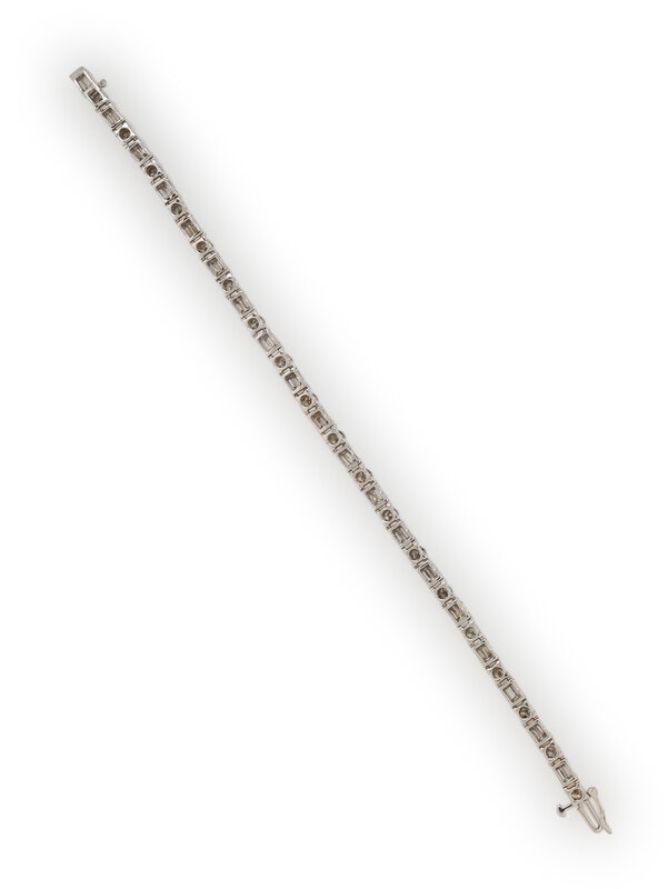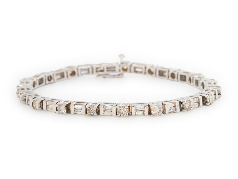 Round and baguette cut diamonds weighing approximately 4.25 carats total. 14 karat white gold. 7 inches long.