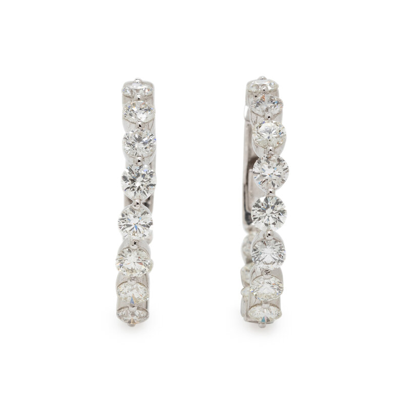 Round diamonds weighing approximately 6.00 carats total. 14 karat white gold. 1 1/4 inches long.