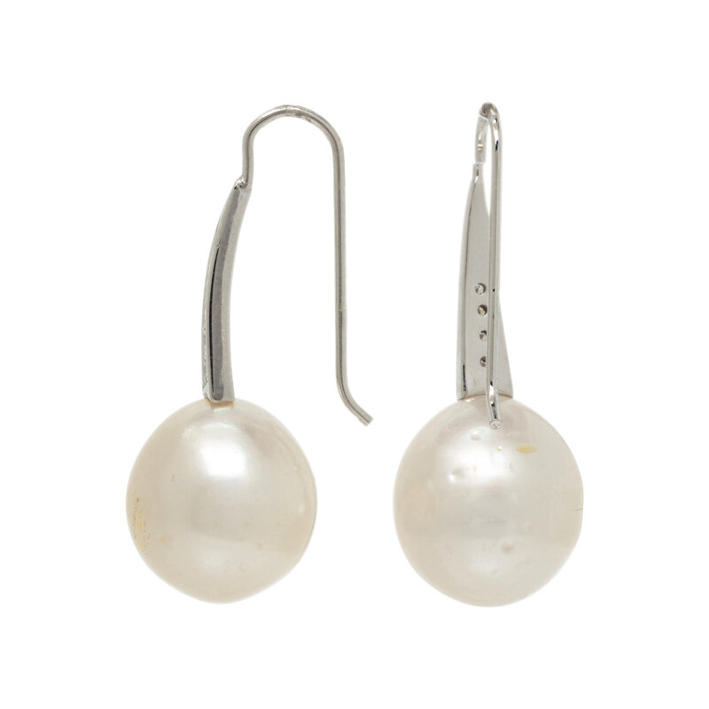 Cultured pearls measuring approximately 13.00 x 14.50 and round and single cut diamonds. 18 karat white gold. 1 3/8 inches long.