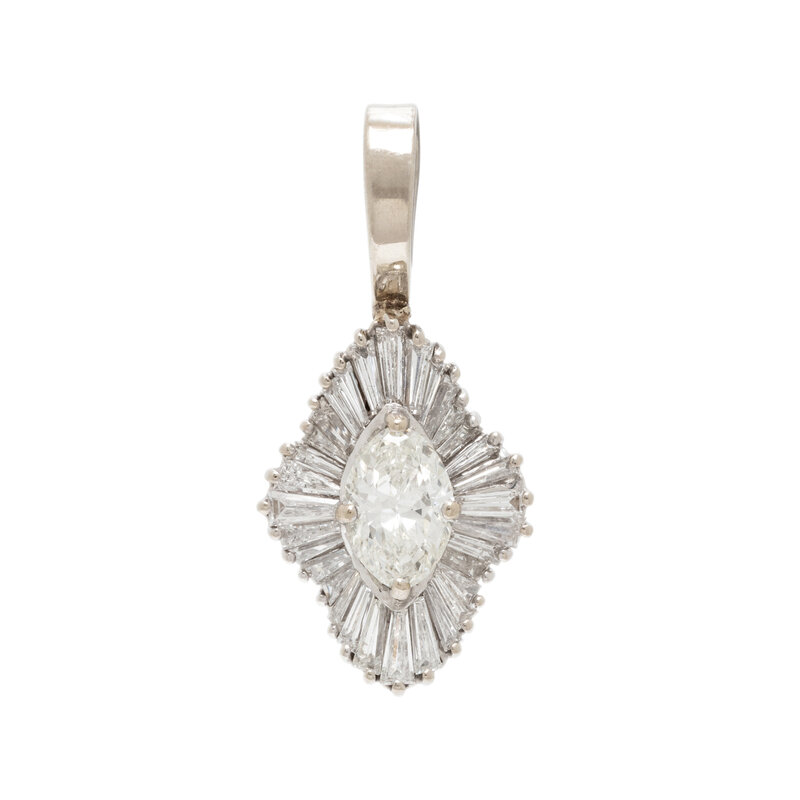 Marquise cut diamond weighing approximately 0.95 carat, and tapered baguette cut diamonds weighing approximately 1.00 - 1.50 carats total. White gold. 1 1/4 inches long.