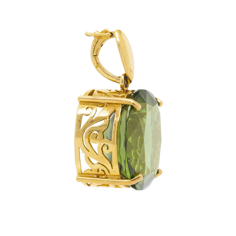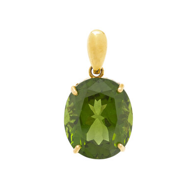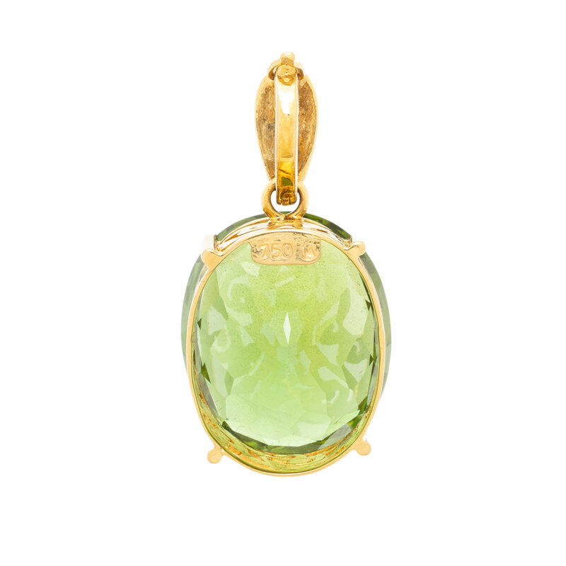 Oval peridot weighing approximately 26.00 carats by formula. 18 karat yellow gold. 1 1/4 inches long.