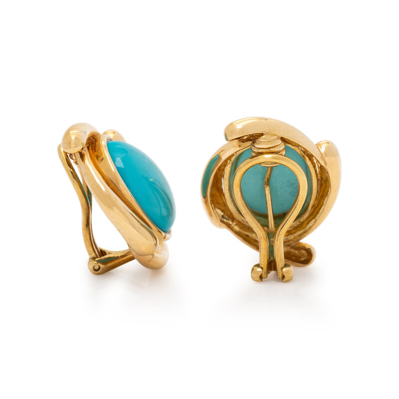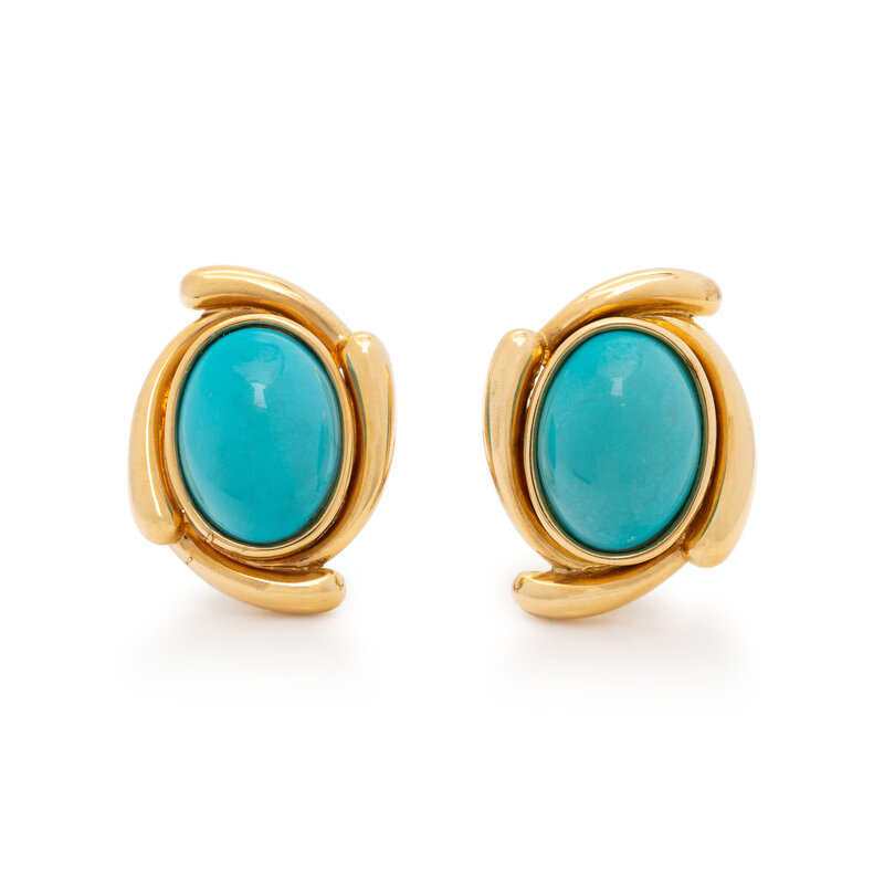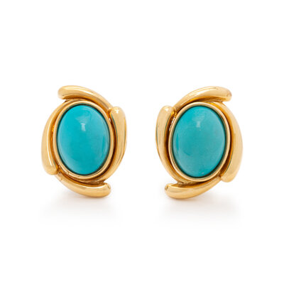 Set with oval cabochon turquoise measuring approximately 16.10 x 11.70 x 5.10 mm. Mounted in 18 karat yellow gold. 1 1/8 inches long.