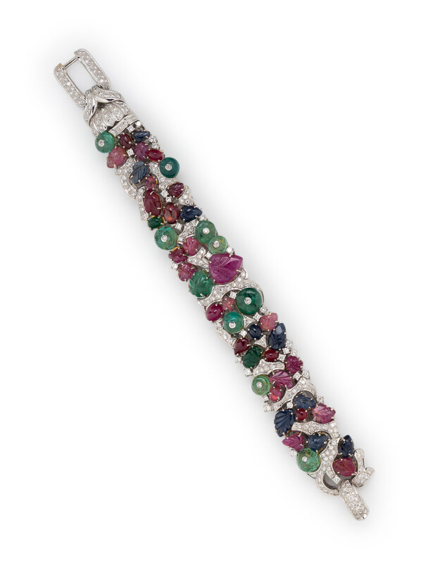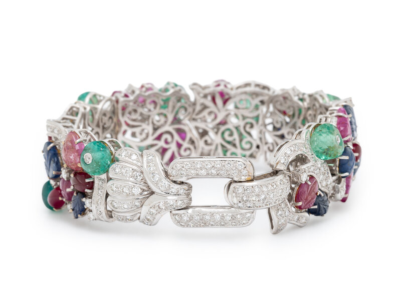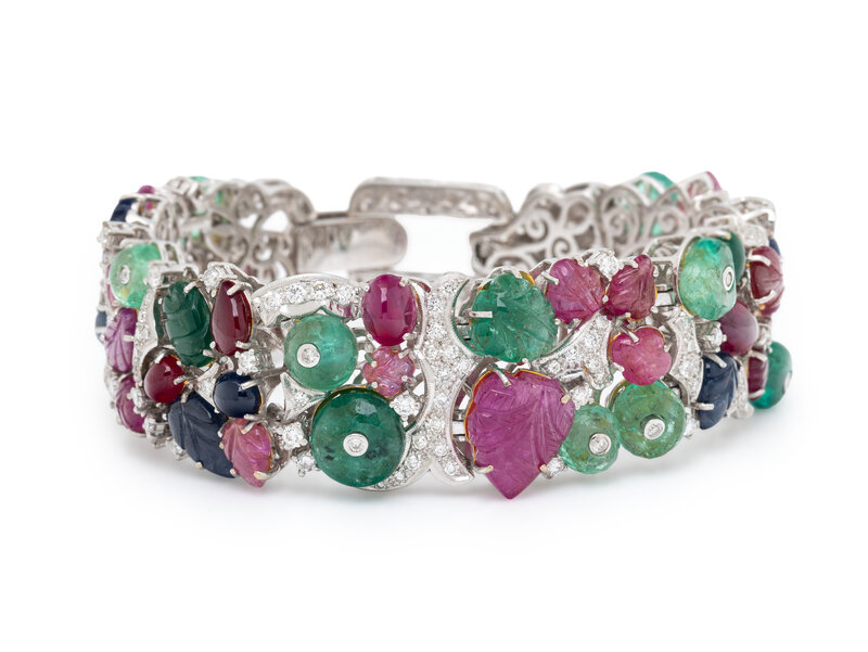 Round diamonds weighing approximately 3.25 carats total, and carved emerald, ruby, and sapphire. White gold. 7 5/8 inches long.