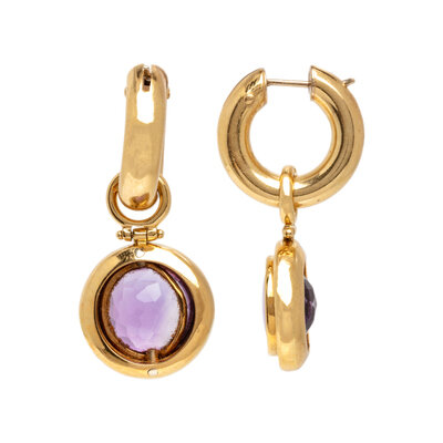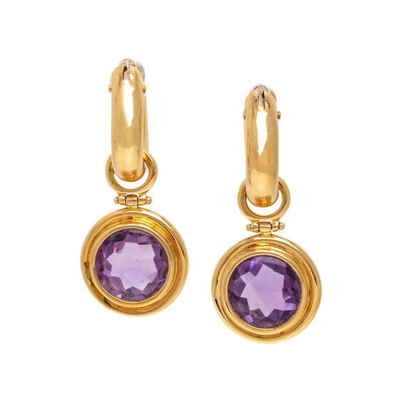 Round buff top amethyst. 18 karat yellow gold. 1 1/2 inches long.