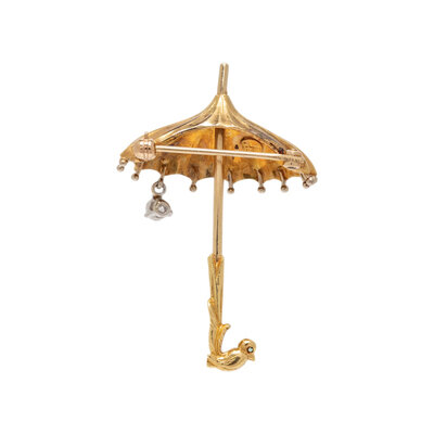 TISHMAN & LIPP, WHIMISCAL DIAMOND AND YELLOW GOLD UMBRELLA BROOCH