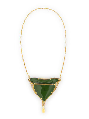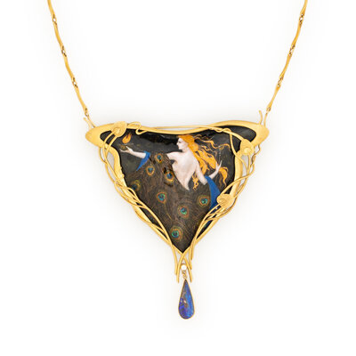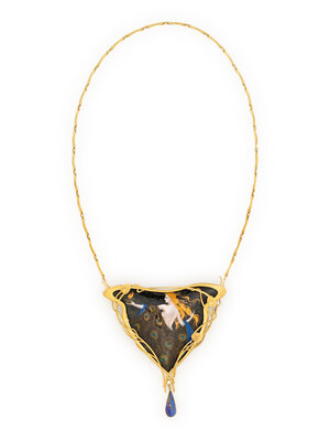 Limoges enamel, pear shape boulder opal, and round diamond. 18 karat yellow gold. Chain: 16 1/2 inches. Pendant: 3 1/4 x 3 1/8 inches.