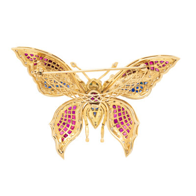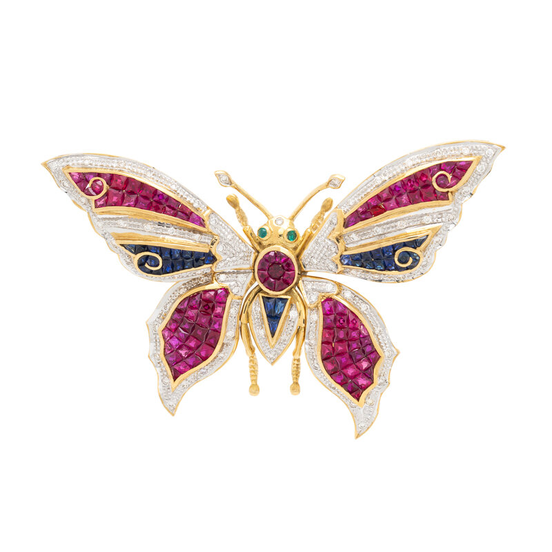 DIAMOND, SYNTHETIC RUBY, AND SYNTHETIC SAPPHIRE ARTICULATED BUTTERFLY BROOCH