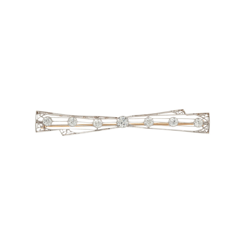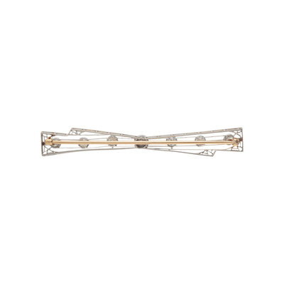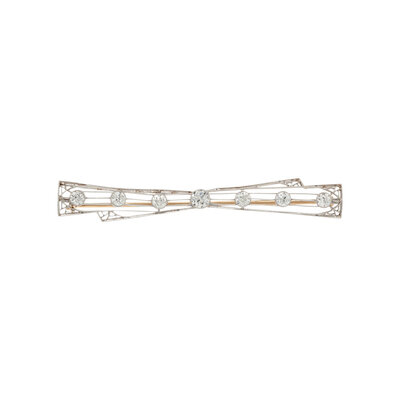 Transitional cut diamonds weighing approximately 1.00 carats total. Platinum and 14 karat yellow gold. 2 1/2 x 1/4 inches.