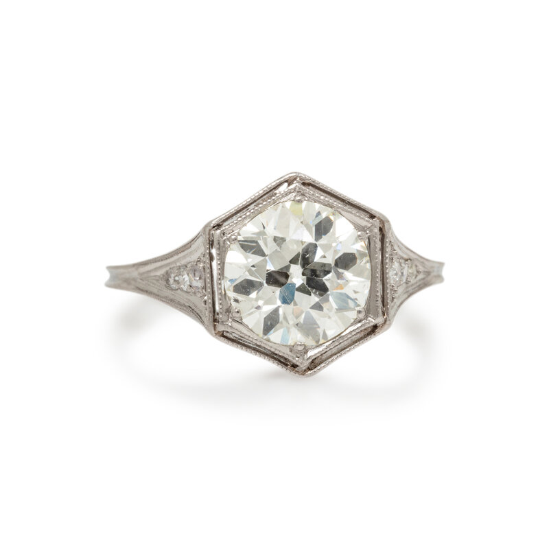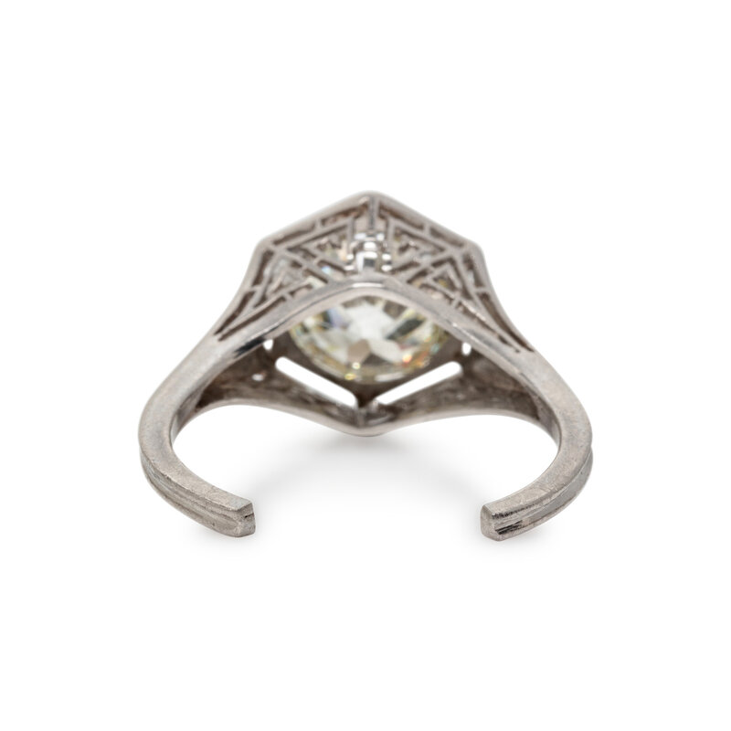 Central old European cut diamond weighing approximately 1.95 carats by formula, and old mine cut diamonds. Platinum. Ring size 6.