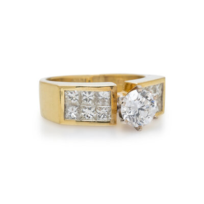 Round diamond weighing 1.28 carats, and 12 princess cut diamonds weighing approximately 1.25 carats total. 18 karat yellow gold. Ring size 8.