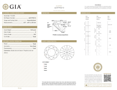 GIA, 2025, Report No. 6237793213, 1.28 carats, G color, VS2 clarity, Faint fluorescence