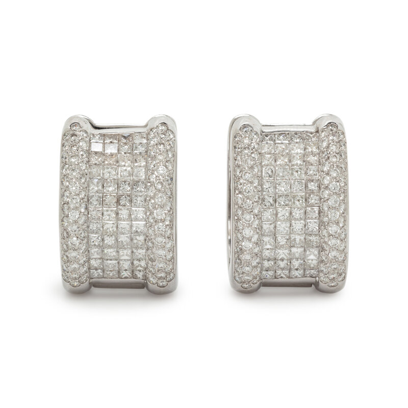 Round and princess cut diamonds weighing approximately 3.50 carats total. 18 karat white gold. 3/4 inch long.
