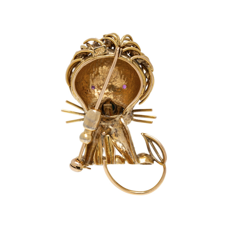 GOLD, DIAMOND, TURQUOISE, AND RUBY LION BROOCH