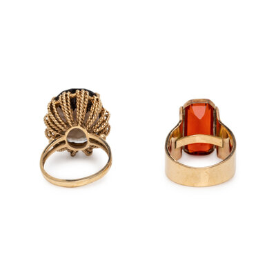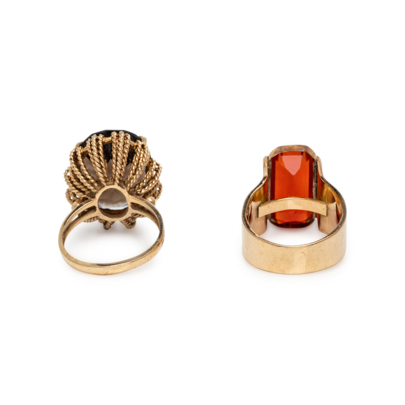 One set with an emerald cut fire opal and one set with an oval smokey quartz. 14 karat yellow gold and low karat yellow gold. Ring sizes 7 and 7 1/4.