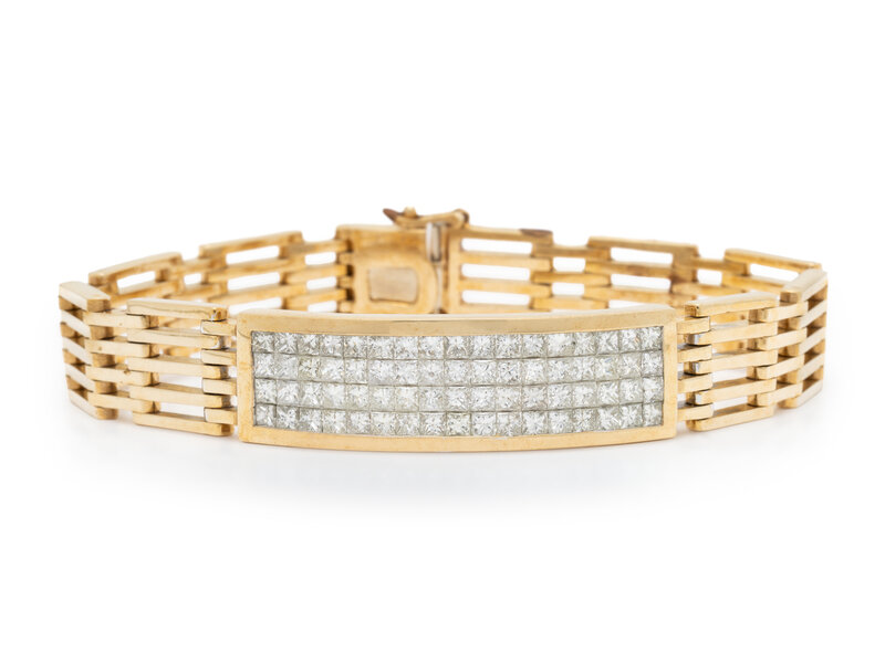 Princess cut diamonds weighing approximately 8.20 carats total. 14 karat yellow and white gold. 8 inches long.