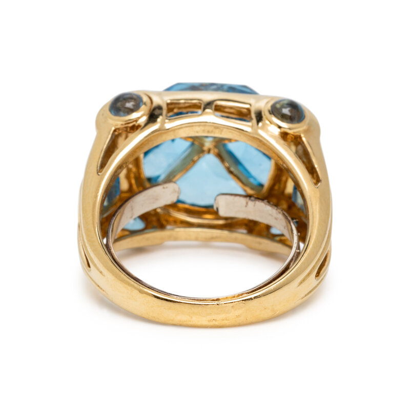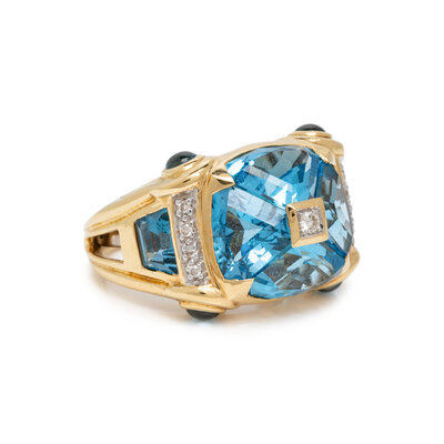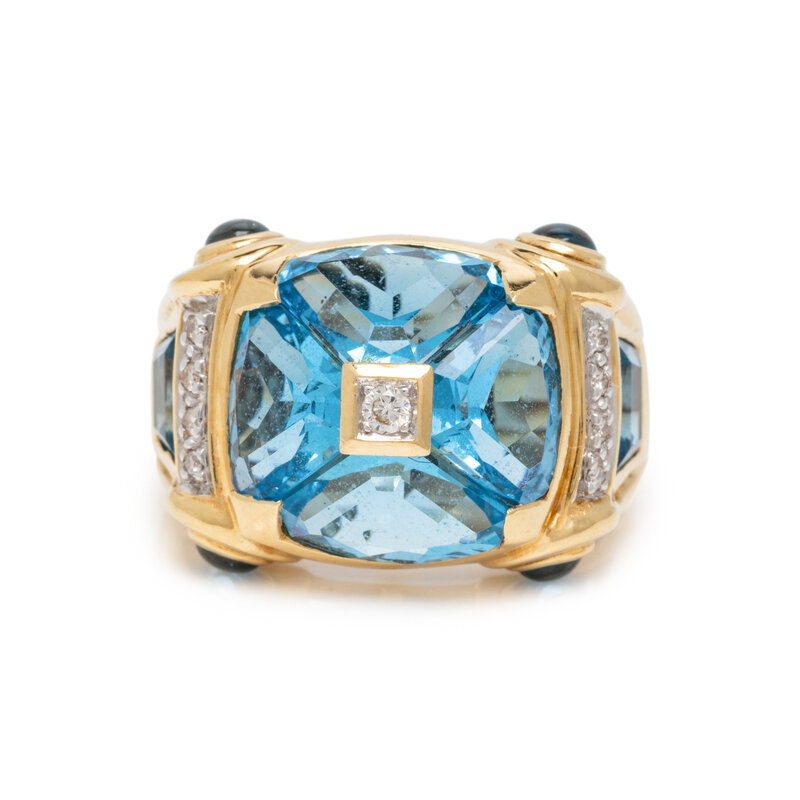 YELLOW GOLD, BLUE TOPAZ, AND DIAMOND RING