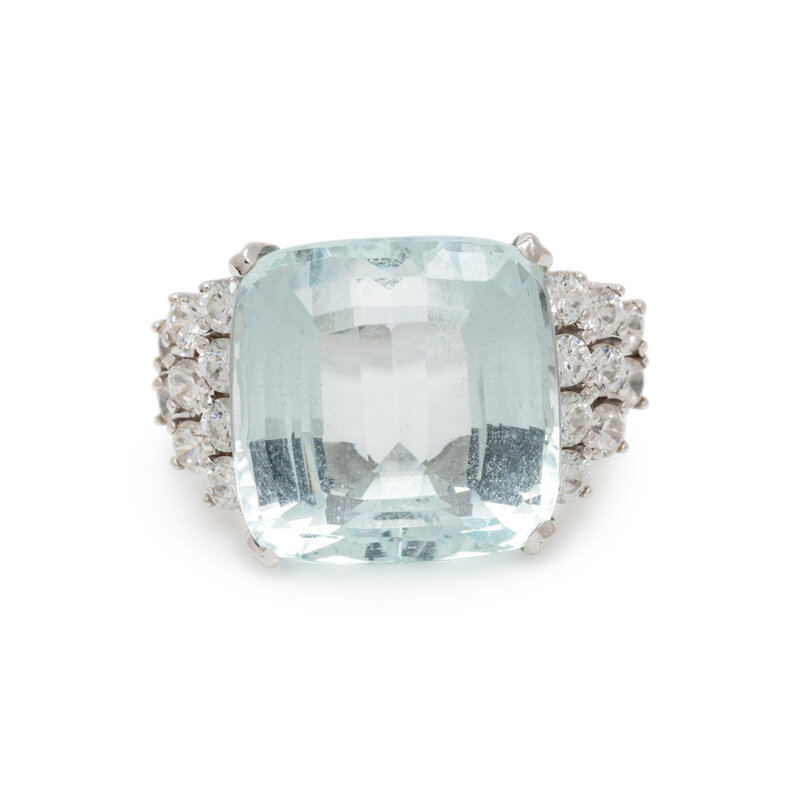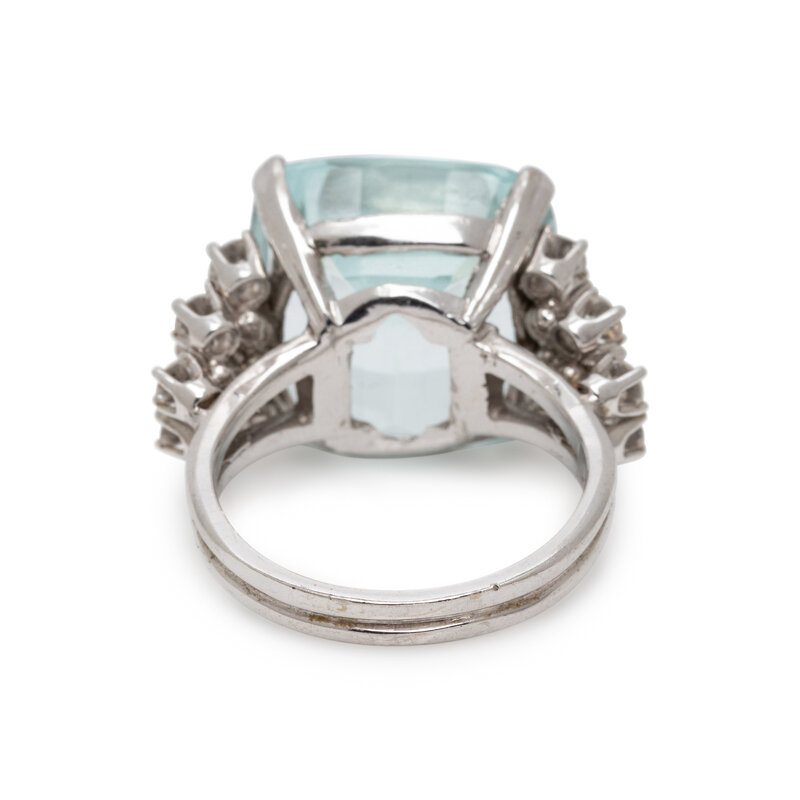 Checkerboard faceted cushion cut aquamarine weighing approximately 11.00 carats by formula, and round diamonds weighing approximately 0.90 carat total. White gold. Ring size 6.