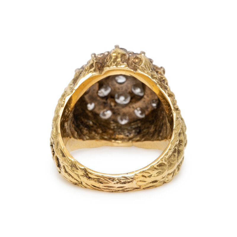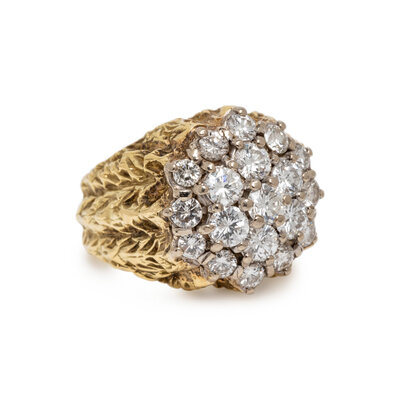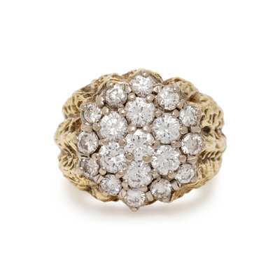 Round diamonds weighing approximately 1.75 carats total. 18 karat yellow gold. Ring size 6.