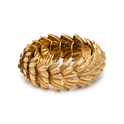 Yellow gold. 7 1/2 inches long, 1 inch wide.