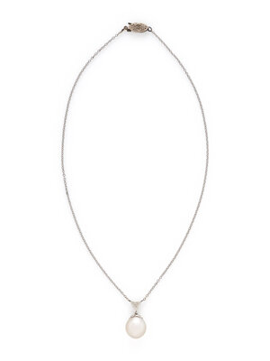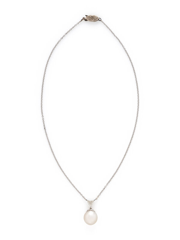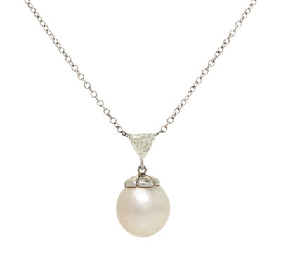 Cultured pearl measuring approximately 11.80 mm and a trillion cut diamond weighing approximately 0.50 carat. 14 karat white gold. 15 inches long.