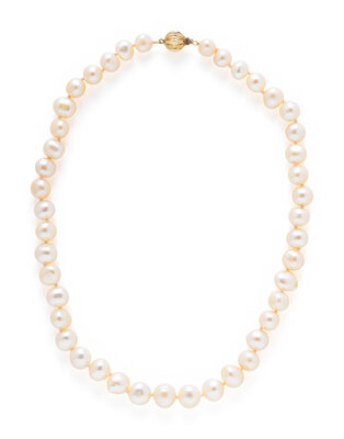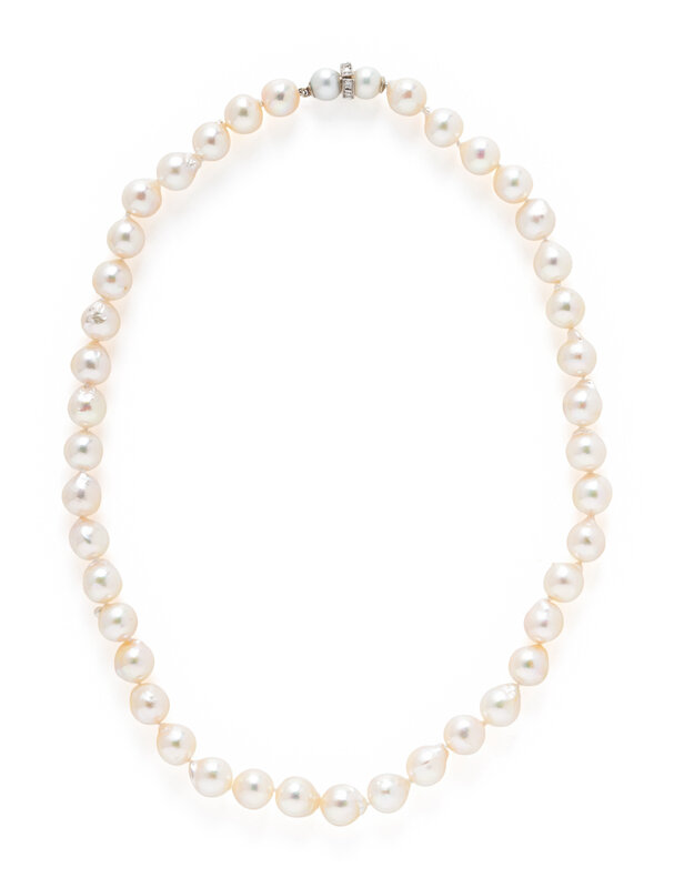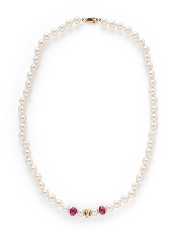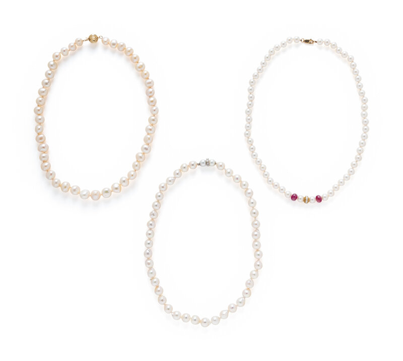 Three necklaces, one with cultured semi-baroque pearls measuring approximately 7.00 - 10.00 mm with a 14 karat yellow gold clasp, one with cultured pearls measuring approximately 7.00 - 7.50 mm, ruby beads, and round diamonds with an 18 karat yellow gold clasp, and one with cultured baroque pearls measuring approximately 7.65 - 9.30 mm with a white gold and single cut diamond clasp. 18 1/2 inches, 19 1/2 inches, and 18 inches long.