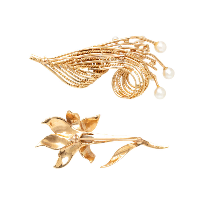 TWO YELLOW GOLD AND GEMSTONE BROOCHES