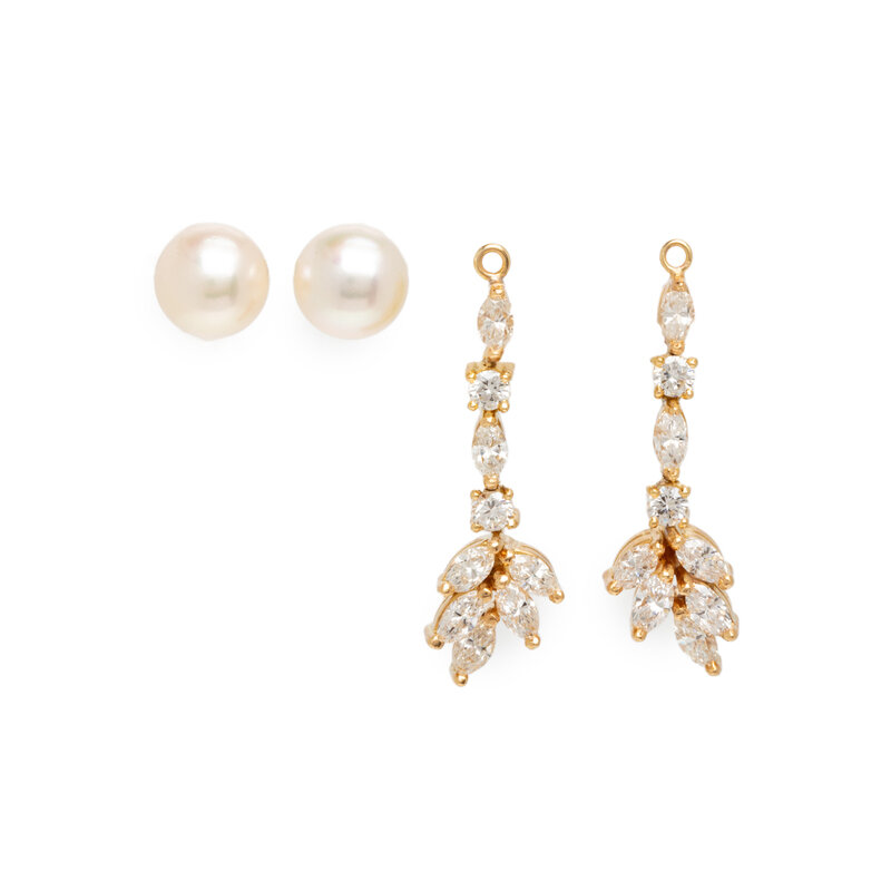 YELLOW GOLD AND CULTURED PEARL STUD EARRINGS WITH DIAMOND JACKETS