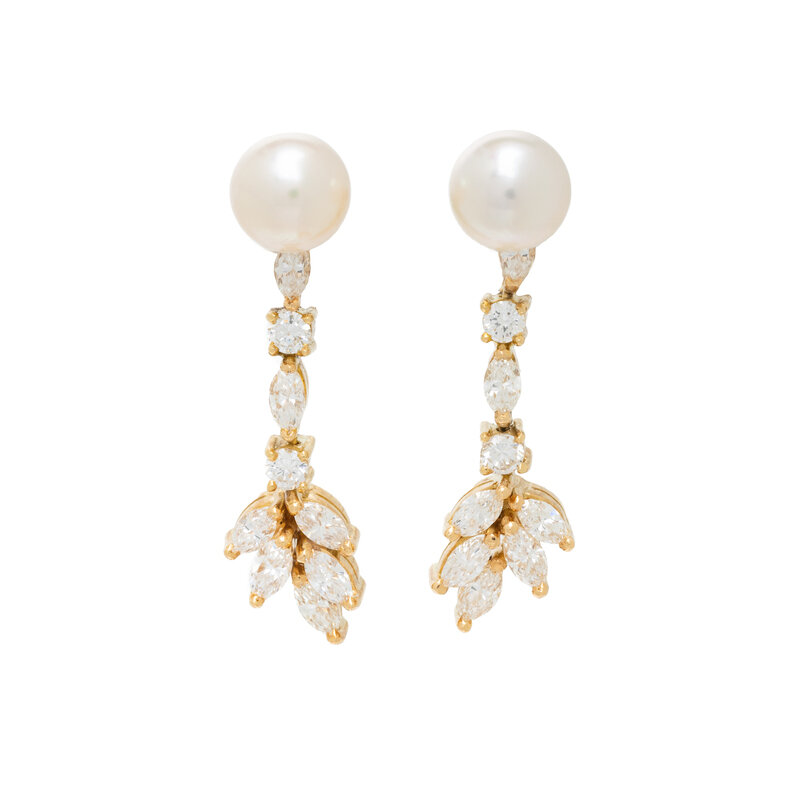 Cultured pearls measuring approximately 8.00 mm, and round and marquise cut diamonds weighing approximately 1.65 carats total. Yellow gold. 1 3/8 inches long.