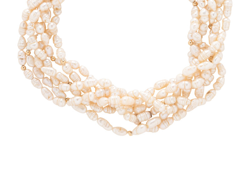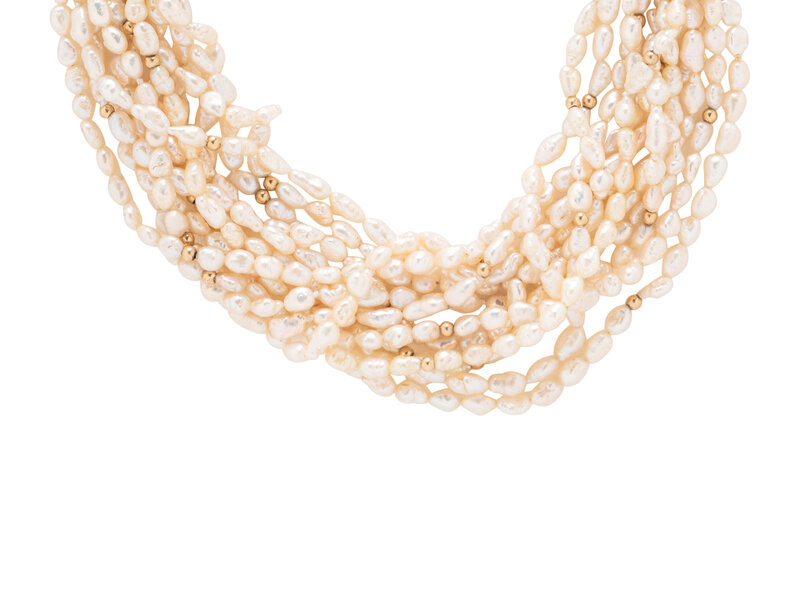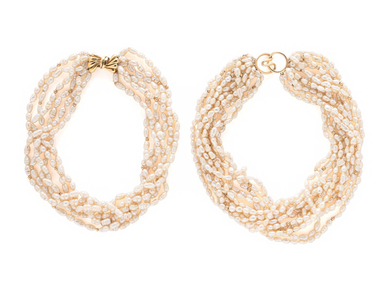 Keshi pearls. 18 and 14 karat yellow gold. 14 1/2 inches long. 14 3/4 inches long.