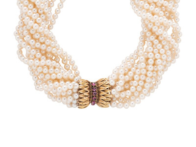 One necklace with cultured pearls measuring approximately 4.00 mm each and round cabochon rubies, and the other with cultured pearls measuring approximately 7.50 - 8.00 mm, round rubies, round sapphires, and round diamond. 14 karat yellow gold and yellow gold. 14 inches long. 15 3/4 inches long.
