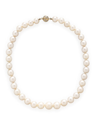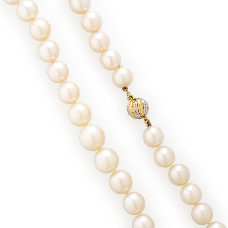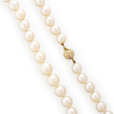 Cultured pearls measuring approximately 10.30 - 12.60 mm, with a 14 karat yellow gold clasp set with single cut diamonds. 17 1/2 inches long.