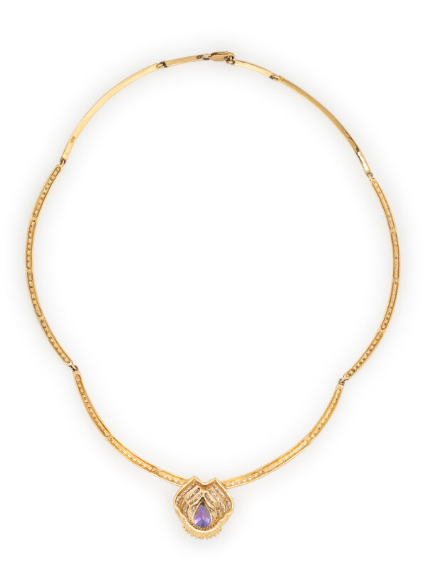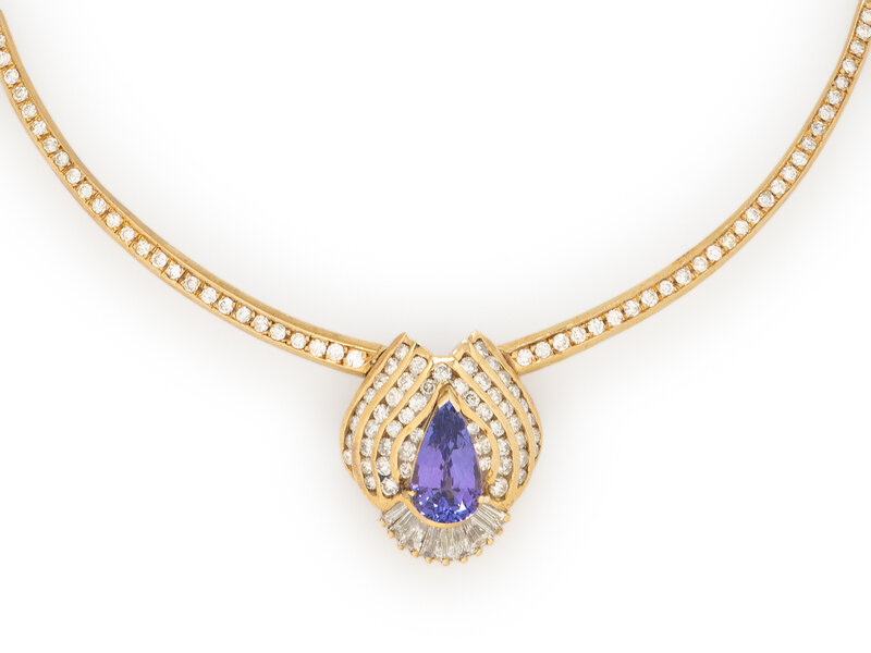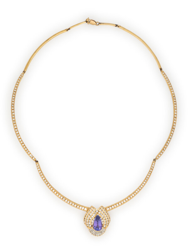 Pear shape tanzanite, and round and baguette cut diamonds weighing approximately 4.50 carats total. 14 karat yellow gold. 17 1/2 inches long.