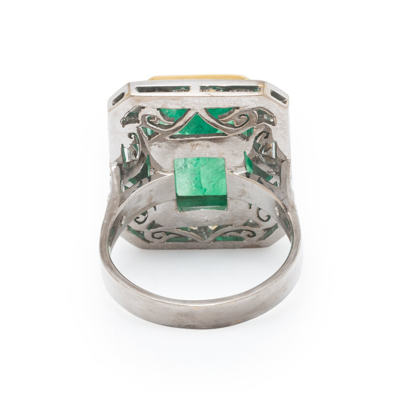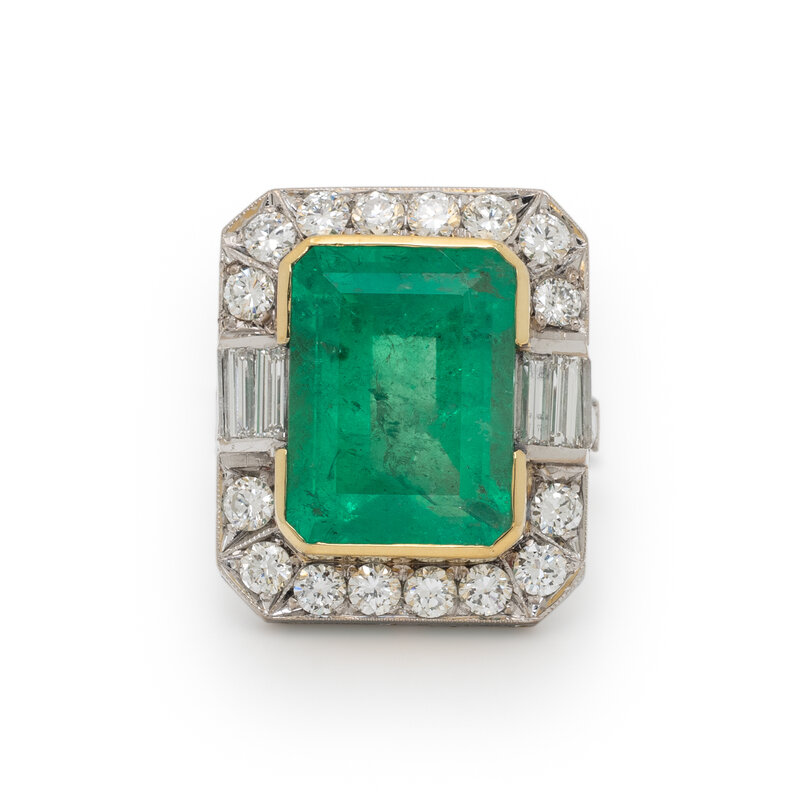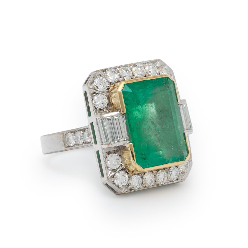 Emerald cut emerald weighing approximately 8.60 carats by formula, and round and baguette cut diamonds weighing approximately 2.50 carats total. 18 karat white and yellow gold. Ring size 8 1/4.