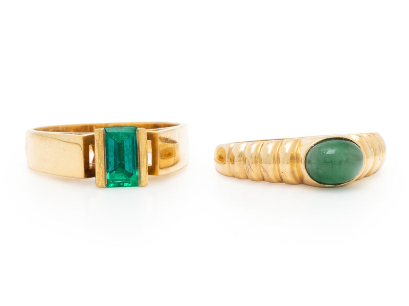 One set with an emerald cut emerald and one set with an oval cabochon cut emerald. 18 karat and 14 karat yellow gold. Ring sizes 6 3/4 and 6.