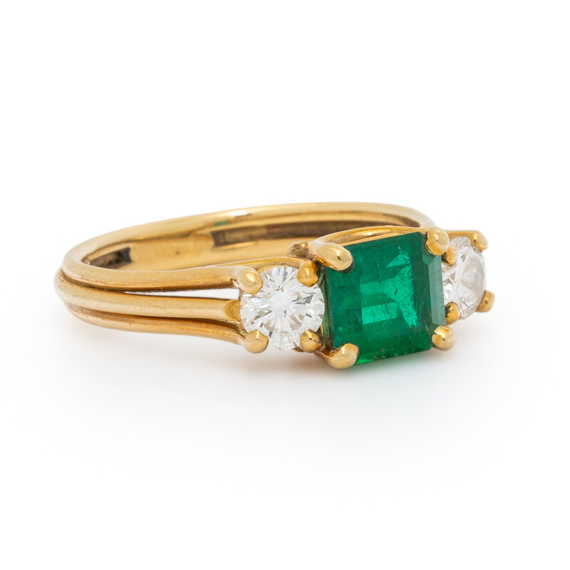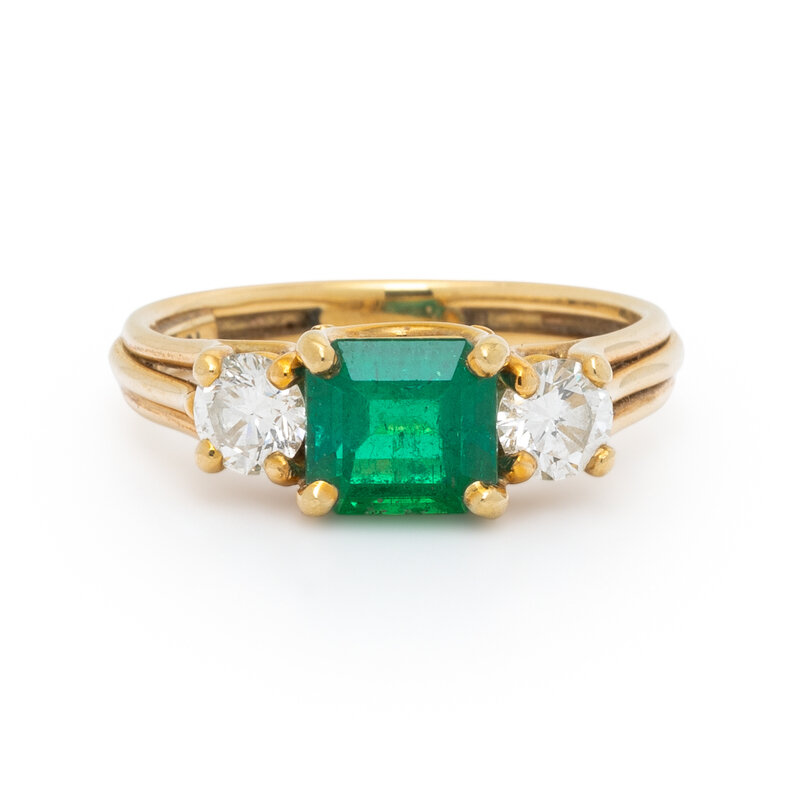 Emerald cut emerald weighing approximately 1.20 carats by formula and round diamonds weighing approximately 0.50 carat total. 18 karat yellow gold. Ring size 7.