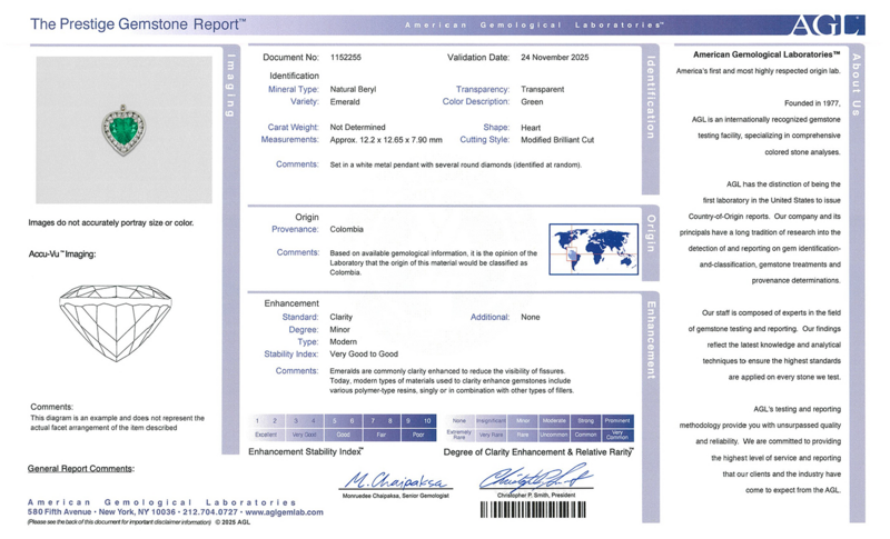 AGL, 2025, Report No. 1152255, Natural Beryl, Emerald, Colombia, Minor Modern Clarity enhancement