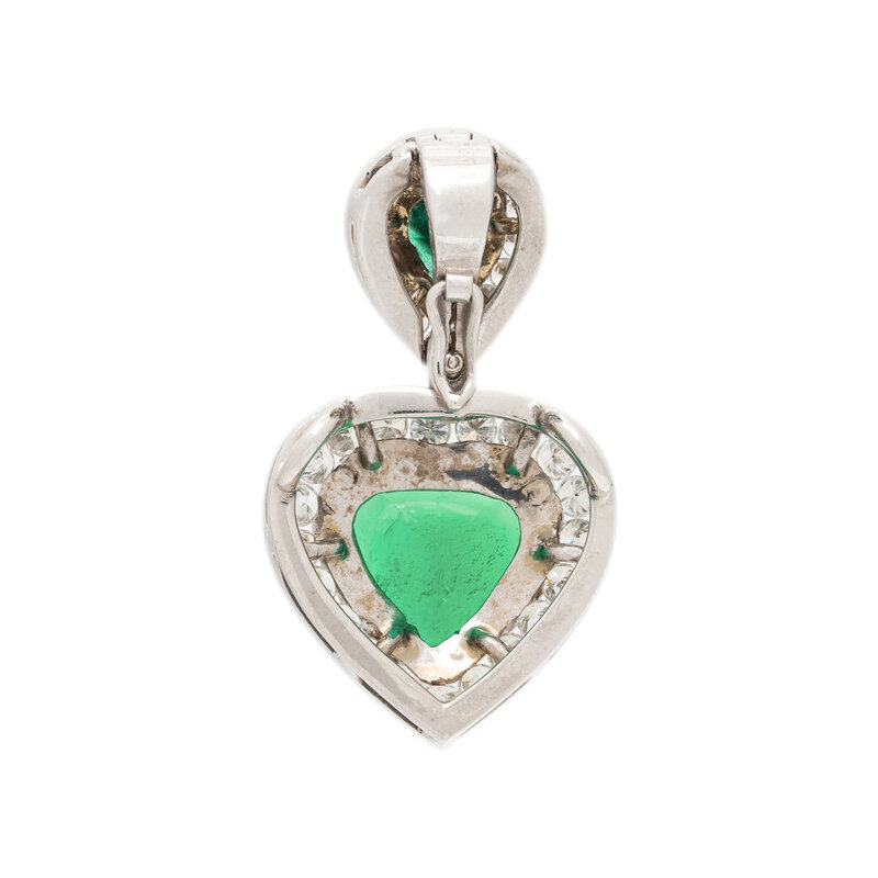 Heart shape emerald weighing approximately 2.00 carats by formula, mounted convertibly as a slide pendant or with a detachable pendant bail, a pear shape emerald weighing approximately 0.50 carat by formula, round diamonds weighing approximately 1.00 carat total. 14 karat white gold. 3/4 inch long, or 1 1/4 inches long with the detachable bail.