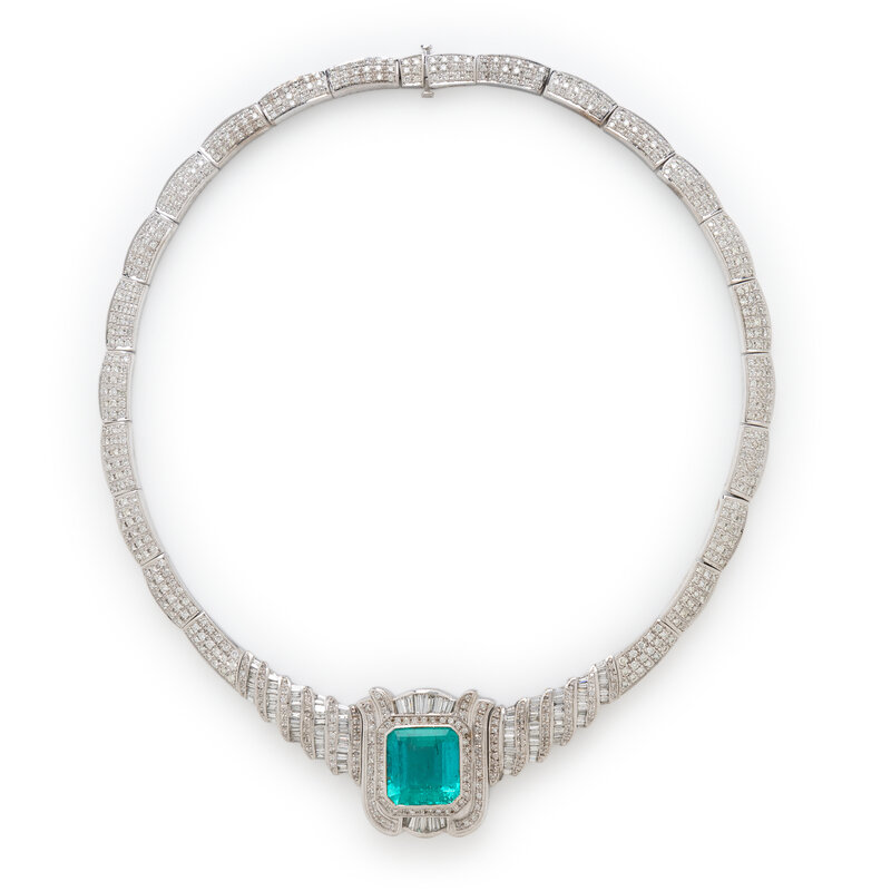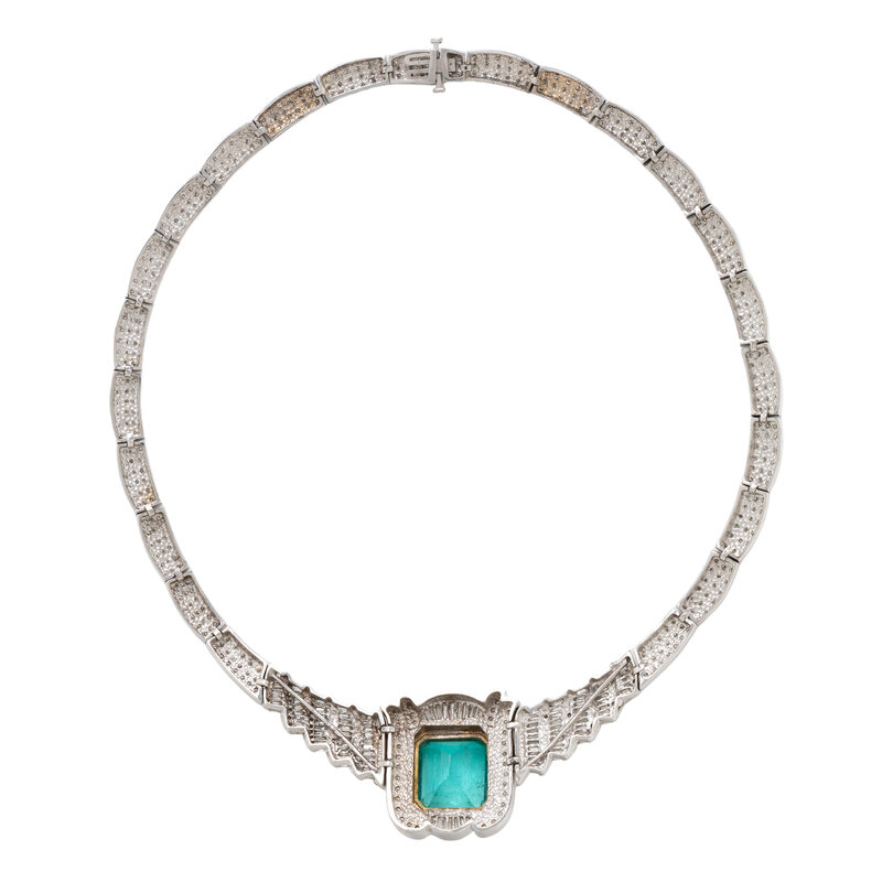 Emerald cut emerald weighing approximately 15.00 carats by formula, and round and baguette cut diamonds weighing approximately 14.00 carats total. 18 karat white gold. 17 inches long.