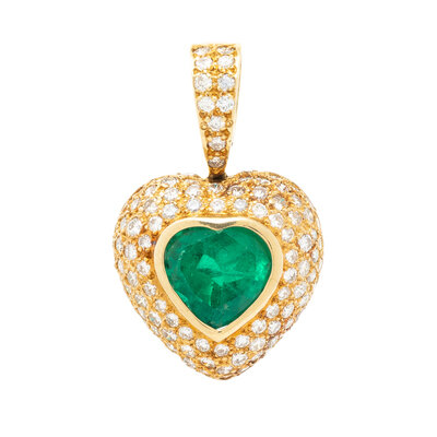 Heart shape emerald weighing approximately 3.60 carats by formula, and round diamonds weighing approximately 1.50 - 2.00 carats total. Yellow gold. 1 3/8 inches long.