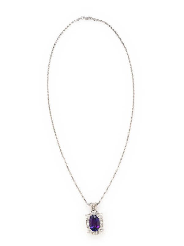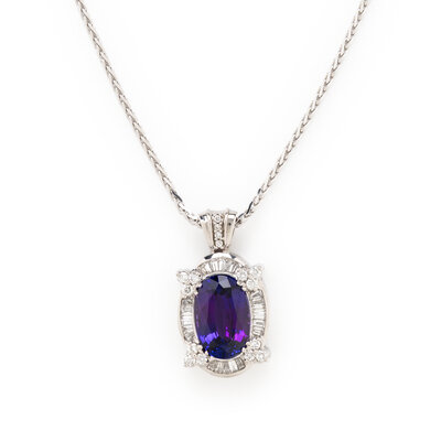 Oval cut tanzanite weighing approximately 13.00 carats by formula, and round and baguette cut diamonds weighing approximately 2.00 carats total. 14 karat white gold. Chain: 20 inches long. Pendant: 1 3/8 x 3/4 inches.