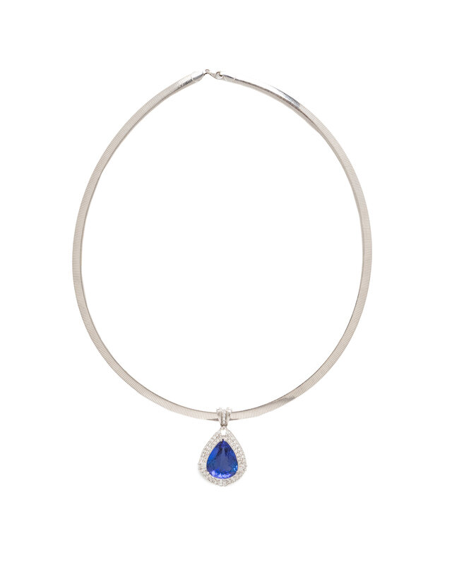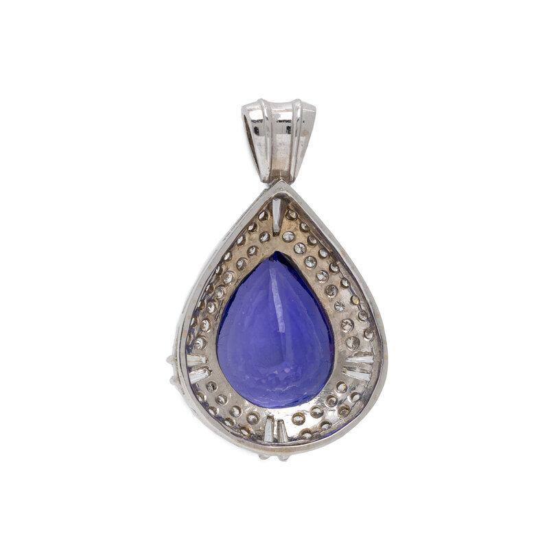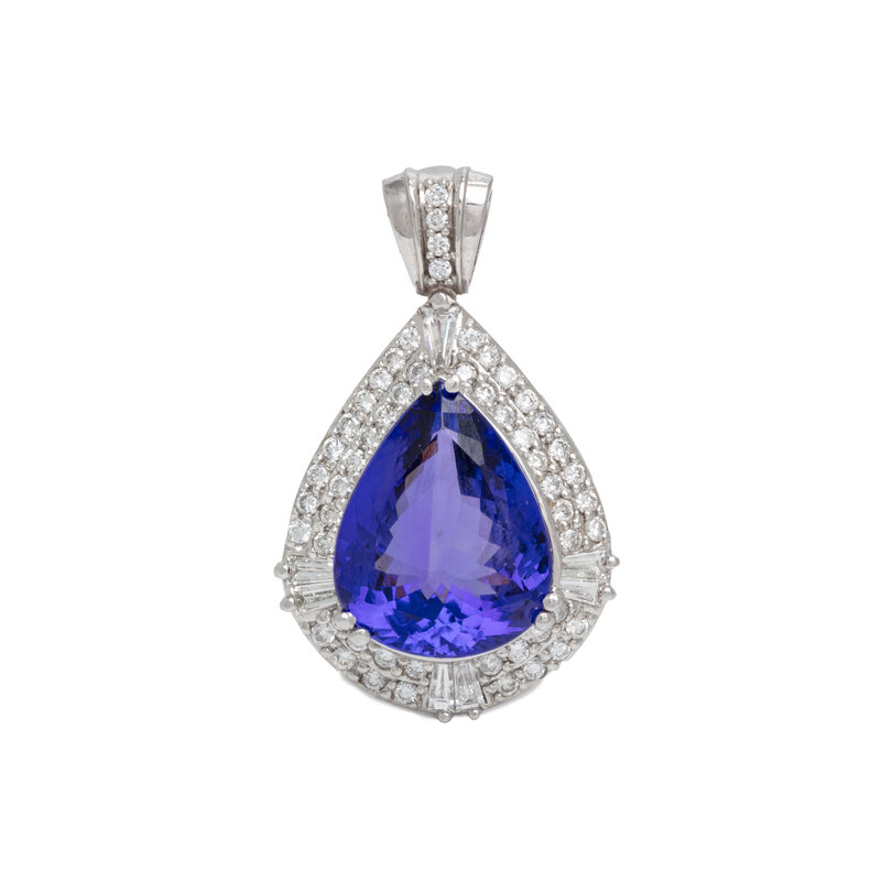 Pear shape tanzanite weighing approximately 18.50 carats by formula, and round and baguette cut diamonds weighing approximately 2.00 carats total. White gold and 14 karat yellow and white gold. Chain: 20 inches long.