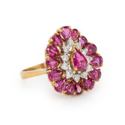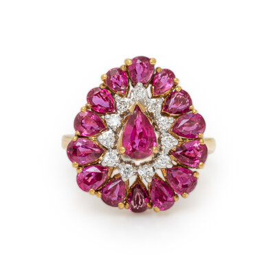 Pear shape rubies and round diamonds weighing approximately 0.15 carat total. 18 karat yellow gold. Ring size 5.