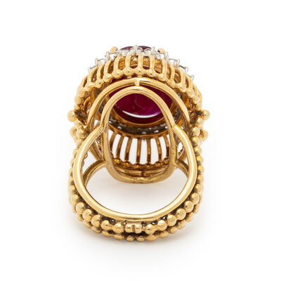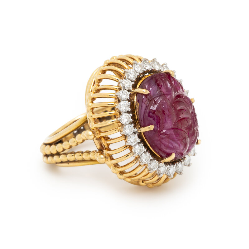 Oval carved ruby measuring approximately 17.45 x 13.60 mm and round diamonds weighing approximately 1.30 carats total. 18 karat yellow gold. Ring size 7 1/2.