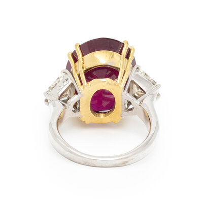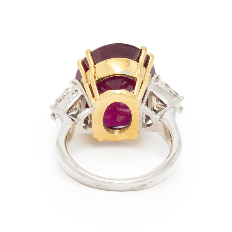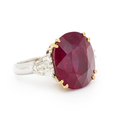 Composite ruby measuring approximately 18.10 x 14.95 x 9.90 mm and shield shape diamonds weighing approximately 1.50 - 1.75 carats total. 18 karat white and yellow gold. Ring size 8.