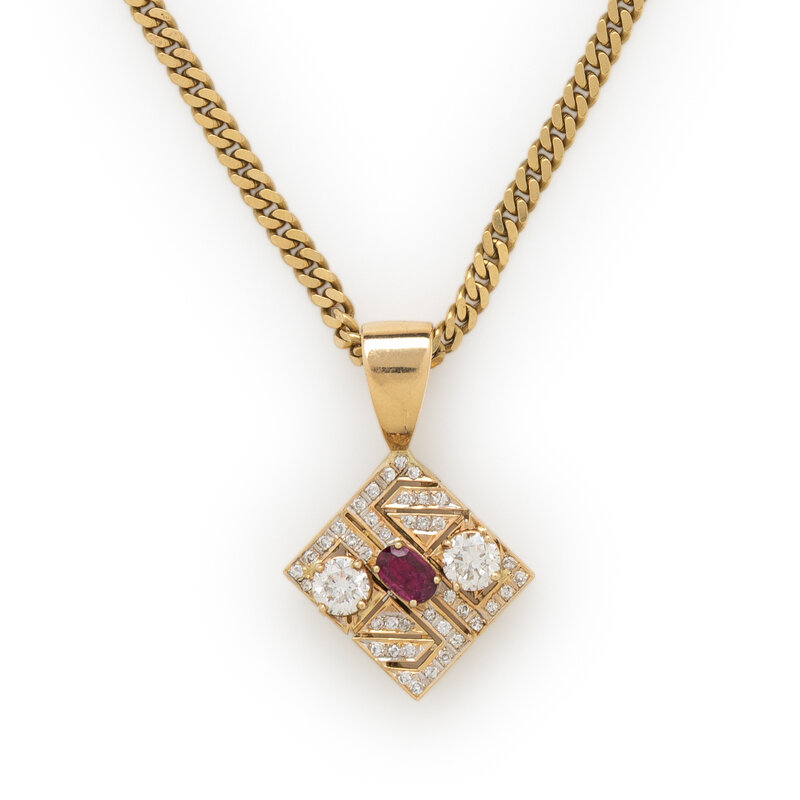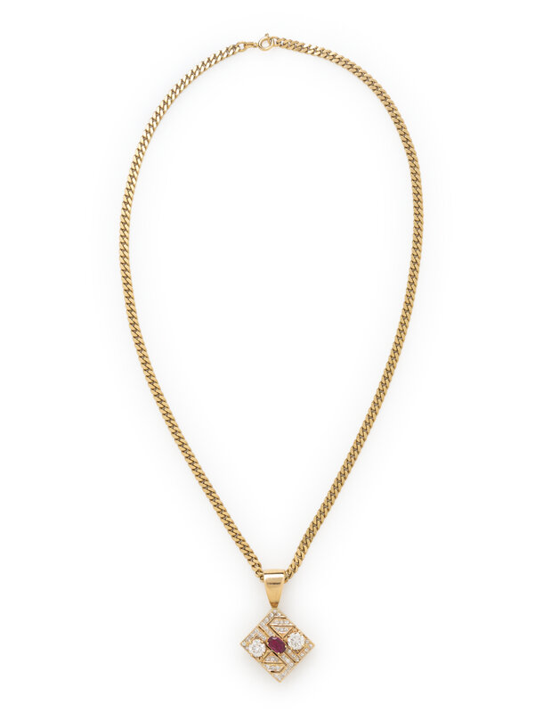 DIAMOND, RUBY, AND YELLOW GOLD PENDANT NECKLACE