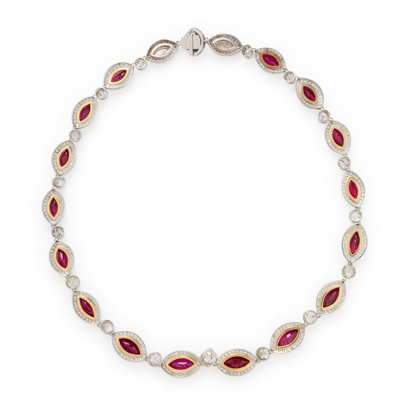 Round, old mine, and old European cut diamonds weighing approximately 13.25 carats total and marquise cut glass-filed rubies. Platinum and 18 karat gold. 18 inches long.