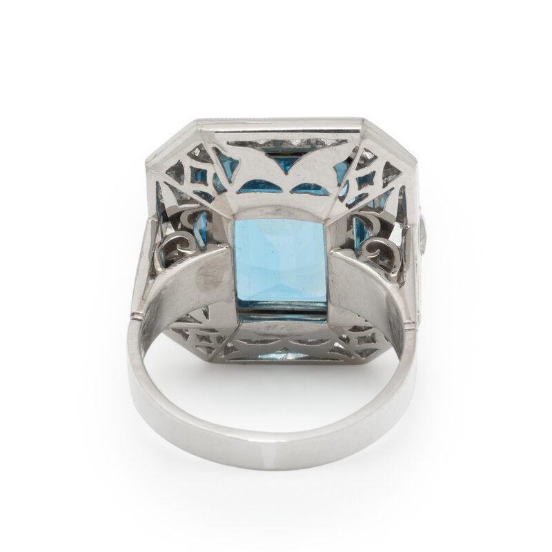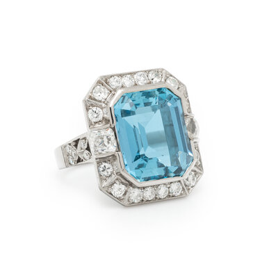 Emerald cut aquamarine weighing approximately 11.00 carats by formula, and round, transitional, single, and old mine cut diamonds weighing approximately 2.00 carats total. Platinum. Ring size 8.