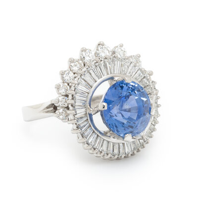 Round sapphire weighing approximately 6.90 carats by formula, and round and baguette cut diamonds weighing approximately 2.50 carats total. Platinum. Ring size 8.